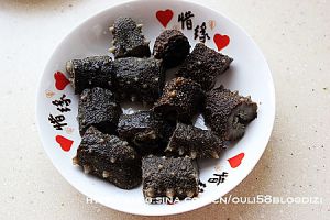 海参泡发后切成小段,放锅里蒸半小时,凉透后使用