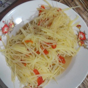 土豆丝放冷水里泡30分钟后。然后是炒。热油,放辣椒,姜丝适量花椒爆香,紧接着放土豆丝爆炒,一定要用大火,再放盐醋就可以出锅了。