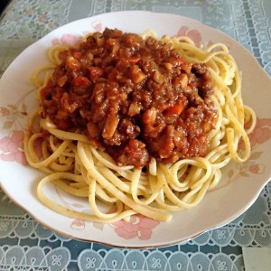 煮肉酱的同时,开始煮意面。锅中倒入冷水,烧开,放盐。100克意面对应10克盐。放入意面。烧的时候搅拌一下以免粘住。烧到意面当中变软了即可。捞出来浸在凉开水中备用。