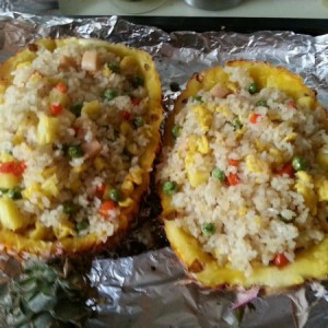 蛋炒饭,食材可以根据自己的喜欢随便加吧!快熟时放入1中的菠萝果肉,翻炒几下出锅,装入菠萝壳中。