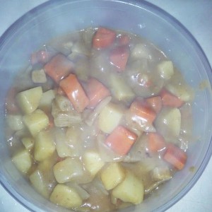 关火放进咖喱块让其自然融化,然后再开火烧开,收汁的浓度根据个人的口味。嘻嘻好了,午饭完成。