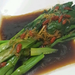 把芥兰摆好,浇汁。摆上些许姜丝和枸杞