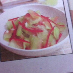 将切好的大蒜和红椒丝与盐,酱油,白砂糖,香油加入腌好的瓜皮中,拌匀,大功告成了哦!^ω^