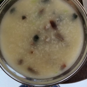 然后锅中烧开水,把闷好的大米倒进去,瘦肉倒进去,煮,然后煮开后小火,在放入松花蛋,熬~根据咸淡可以酌情加盐。然后在出锅前滴一滴香油,放入葱花。然后出锅。