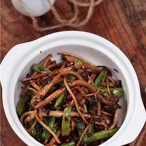 干红辣椒切成小段、葱切成末,扁豆掰成段,茶树菇去除根部洗净控干水分