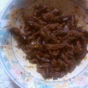 锅放热油,至油温90度左右,将煮好的牛肉丝放入,至水汽收干亮油,锅里留少许油,加干辣椒面,花椒面,芝麻翻炒均匀起锅。