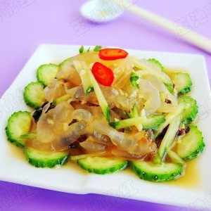 把黄瓜丝放入海蜇丝中,加醋,生抽,白糖,盐,辣椒油,香油搅拌均匀即可。