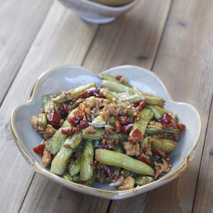 炸锅置火上,倒入香油大火烧至五成热时,放入四季豆,改成中火慢慢煸至表面变白,外皮开始出现皱褶时,捞出沥干油备用。