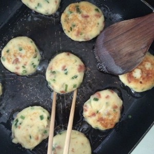 放入平底锅中煎到金黄,记得不能捏得太大块。