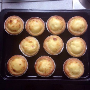 然后把蛋挞放进烤箱里上下220度 烤25分钟 在快剩下2-3分钟的时候从中间层移去上面一层在烤 把它烤出虎斑即可出炉