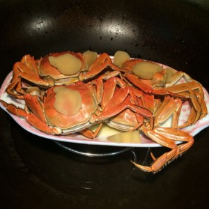 锅中加入水、然后把姜片放在蟹身上、倒点料酒、要蒸的时候把蟹反过来蒸、