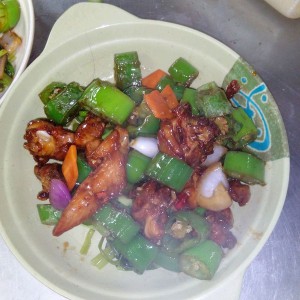 4 热锅冷油,将辣椒干,朝天椒爆香,倒入炸好的鸡肉炒均匀 调味勾一点欠加入葱段即可出锅。