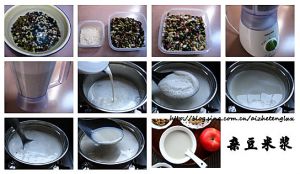 把豆子和大米放入附带滤网的搅拌机内,加入水打磨4-5遍,再把打好的米豆浆倒出在烧锅中。