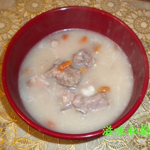 大米泡发后倒入搅拌机打碎,5碗水将米碎煮开,倒入排骨煮30分钟,倒入枸杞再滚5分钟——好啦!