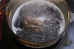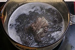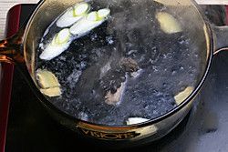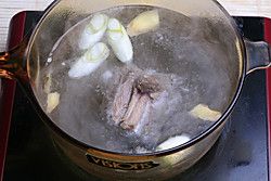 锅中做开水,放入牛尾、葱姜,开锅撇去浮沫后再加入绍酒。
