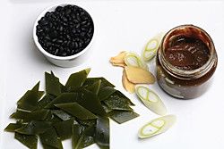 海带洗净切菱形块,黑豆提前半天用清水泡发,葱切段,姜切片。