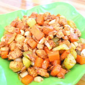 然后倒入切好的胡萝卜丁和花生米煸炒一会