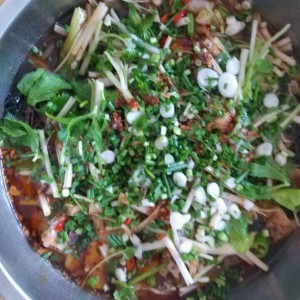 倒油入锅,加热后放入小红辣椒姜蒜大葱白花椒八卦大料郫县豆瓣爆炒,炒出红油香味就放水进去,水煮开多熬会儿就把鱼头放进去,依次放鱼排鱼片,煮几分钟,再放入嫩姜丝小红辣椒青辣椒芹菜煮一分钟就起锅