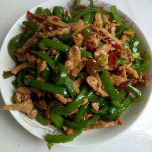 然后把肉丝倒入翻炒,大约一分钟后加入剩下的姜丝辣椒丝,炒两分钟左右,倒入青椒丝。翻炒至熟。这个过程尽量用大火。然后尝一下味道,如果淡了就加点盐。