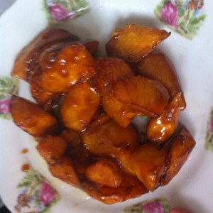 将大概两大铲子的糖倒入锅中来回翻炒,直至熬成糖稀,把炸好的地瓜倒入滚匀即可!