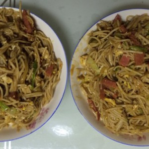 将肉和甘蓝放到锅里翻炒,加少于酱油盐,加方便面酱料,最后加入炒好的鸡蛋