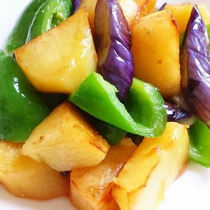 把茄子炒至表皮起皱变软倒入土豆、青椒继续翻炒片刻;