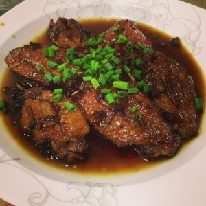 五分钟后开大火收汁,放少许盐翻炒,起锅摆盘,放葱叶