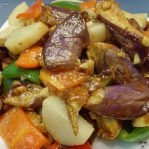 蒜瓣烹锅,将炸熟的茄子块炒热,倒入山药、青红椒,倒入蒜末,淋上芡汁,翻炒出锅。