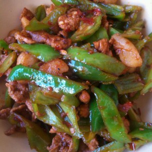 加入准备好的青椒,加入糖,调入食盐,翻炒均匀