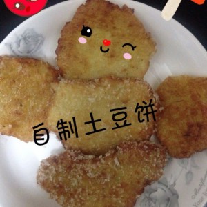 空盘上倒出面包糠,把搅拌好的土豆泥两面都铺上面包糠。