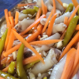 切胡萝卜丝,拍蒜蓉,拿一干净盒子,放入半瓶泡椒和泡椒水,胡萝卜丝,蒜蓉,白醋,白糖,盐,酱油,调泡椒水
