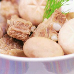 加入白蘑菇炖20分钟,最后放盐、胡椒粉调味即可。