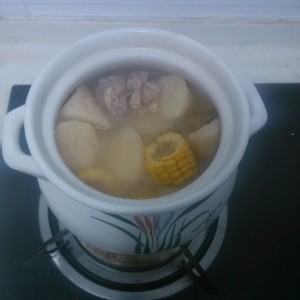 放入玉米段,山药块,虚盖,大火烧开,调小火煲煮,加适量盐调味