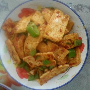 锅中倒油,烧热放姜,葱爆香,小火放辣椒酱(鲜的)或者豆瓣酱,炒至出香味倒入煎好的豆腐翻炒,放入生抽,盐翻炒上色,将少许青椒放入,炒几下,放鸡精,胡椒面,好了,装盘咯。
