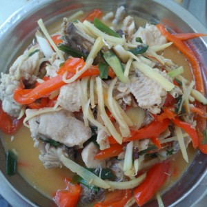 在煲汤的过程中,我们准备配件,嫩姜切成长条状的丝,蒜切片,红辣椒切条状,香葱切段