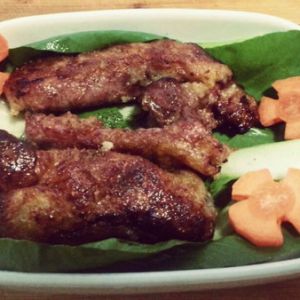将青菜垫盘,然后在排骨上洒上椒盐,用胡萝卜切花装饰。