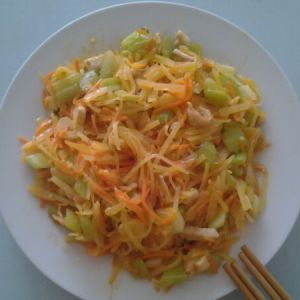 再倒入土豆芹菜翻炒,再倒入胡萝卜,一起翻炒