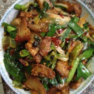 锅内放油,烧至七八成熟,放人少量红花椒,起味后放入五花肉翻炒,在翻炒过程中放入2勺豆瓣酱,待豆瓣酱炒熟后放老抽上色,翻炒两下再入豆歧、盐后白糖,翻匀后放入蒜苗,待蒜苗炒软后放盐味精调味起锅。