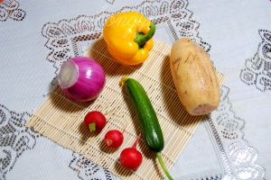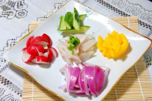 莲藕切块焯水,过凉水待用,其余改刀待用!