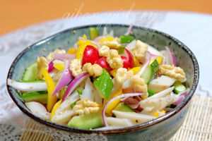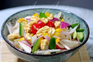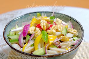 把各种主料放入料碗,加盐,鸡精,白糖,香油,白醋,花椒油,熟芝麻,核桃仁,搅拌均匀,装盘即可!