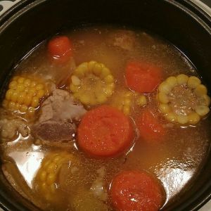 放排骨,放开水 滴两滴醋。炖半小时再放玉米胡罗卜。炖上一小时放盐鸡精美汤完成。