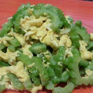 炒锅底油烧热,加苦瓜煸炒,放入鸡蛋炒散,加耗油盐,出锅