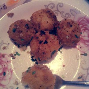 煎至两面金黄,盛入盘子,锅里留一点点油,再放入土豆饼,然后盐,鸡精,出锅前放入葱花,盛盘即可。