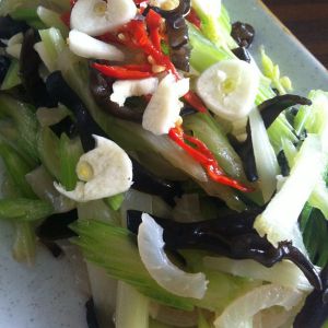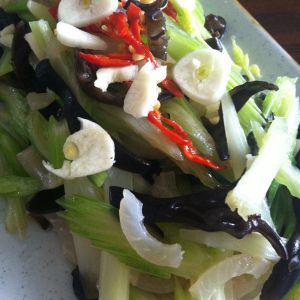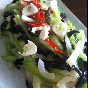 西芹,黑木耳切丝汆烫30秒左右,再浸入冰水