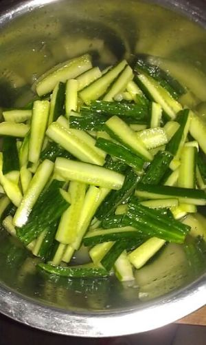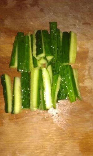 把切好的黄瓜段用盐杀一下水份,腌大概10分钟左右,控出水份。