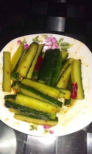 锅中烧热油,8成热下入花椒爆香,然后下入小红尖椒段,稍微翻一下就关火,热油倒入黄瓜中,搅拌均匀。腌制30分钟使其入味。盛盘时撒上香油即可。