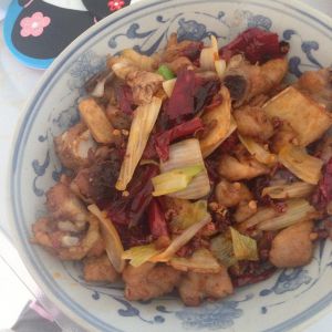 鸡腿切适当大小。不用去骨。放料酒。五香粉。盐{多一点}研制半小时。葱,姜。辣皮子。蒜适量