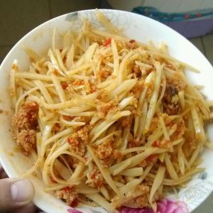 到入准备好的榨胡椒,和土豆丝一起翻炒,出锅!