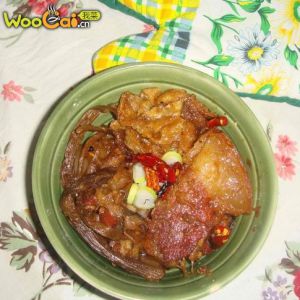 放入少许油,将葱,蒜和辣椒放入煸香,倒入茄子和腊肉一起翻炒,放甜面酱,醋(2勺),糖(1勺),改小火