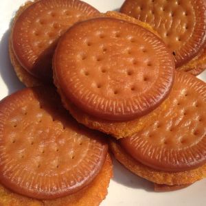 如图两面用饼干夹着,锅内倒入油,小火炸,油温扣好,因为饼干很容易糊了。